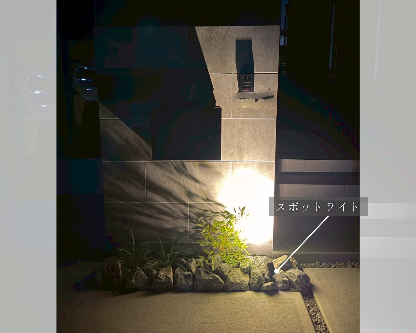 門柱前にはスポットライトを配置し、夜でも素敵におしゃれな空間を演出します。