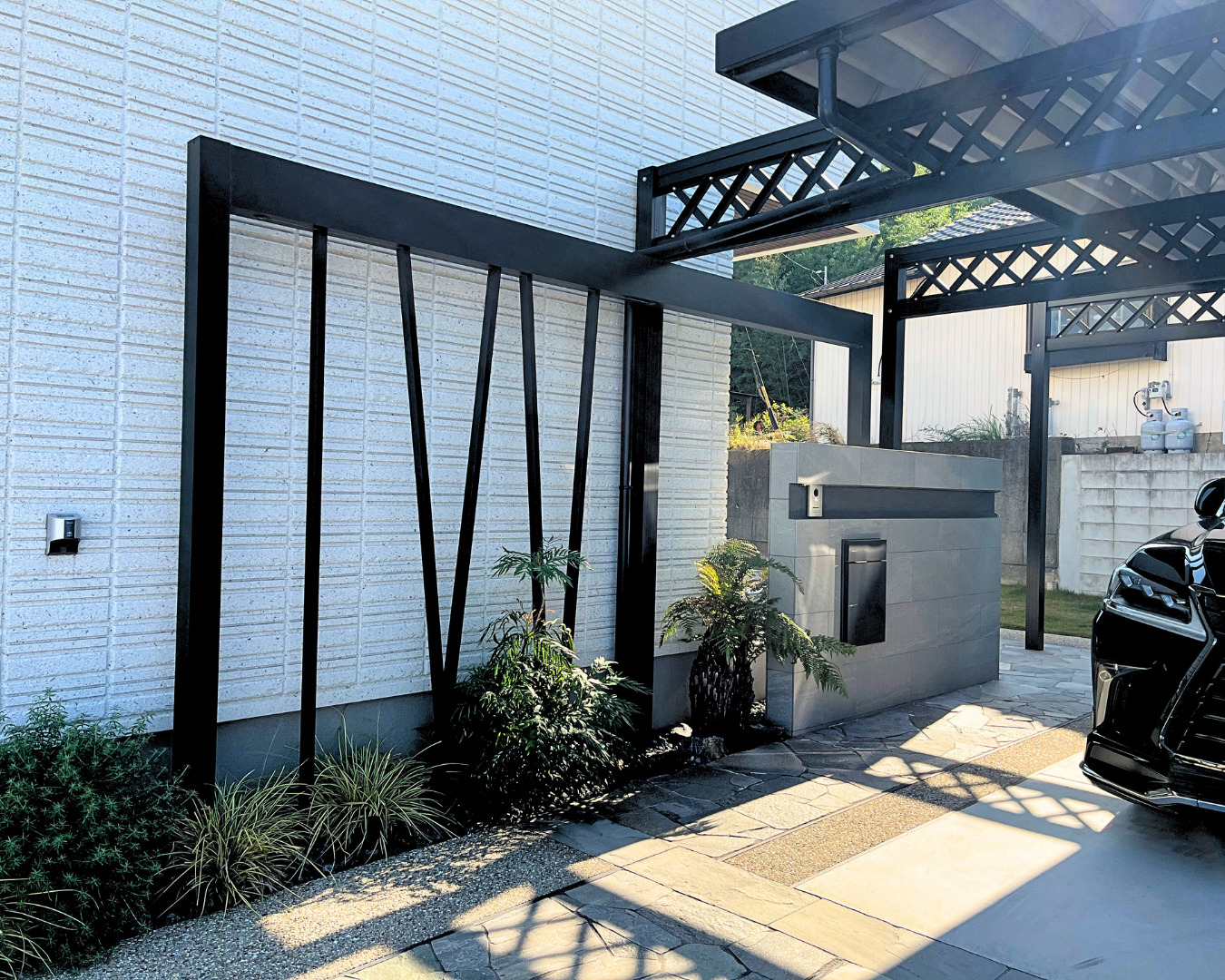 帰宅するのが楽しみになるような、ブラックのフレームとタイル門柱、植栽が美しいアプローチです。