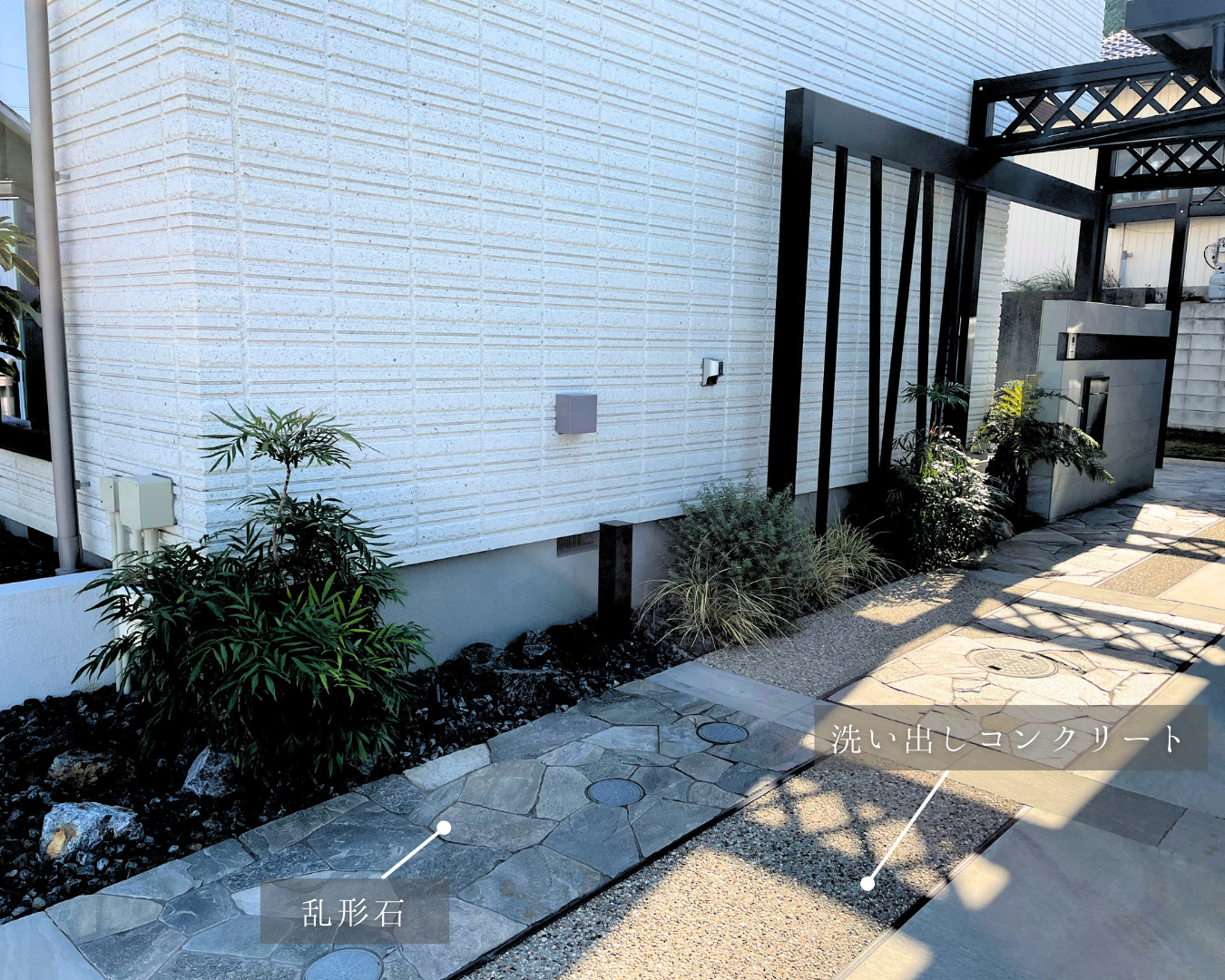 アプローチは乱形石と洗い出しコンクリートを採用。